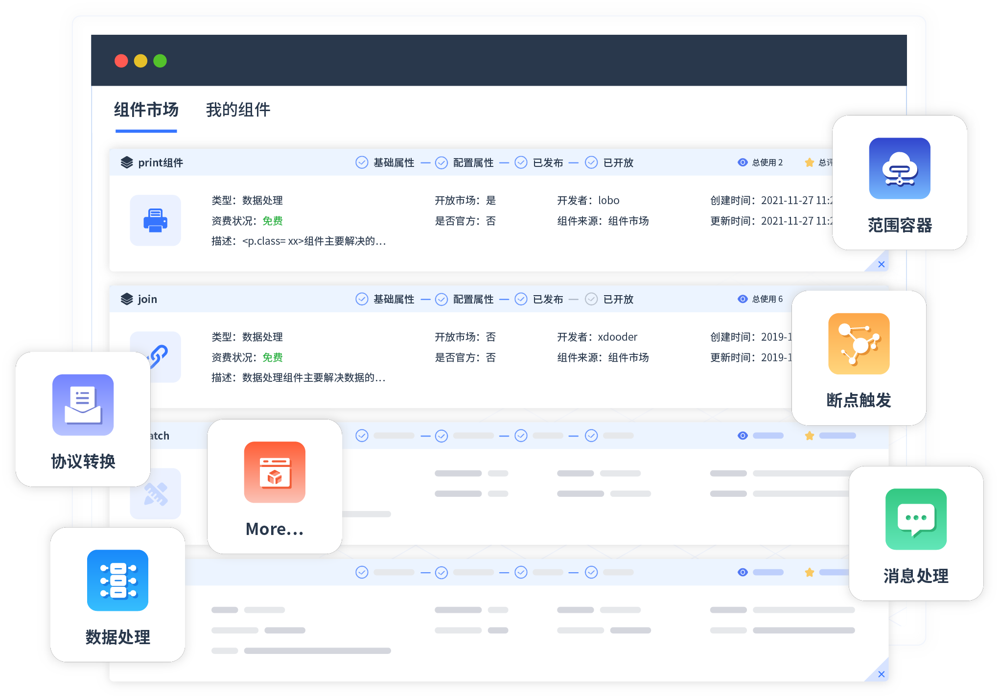 针对集成场景,,,,圆梦钱包提供组件市场,,例如协议转换、、、、消息处理、、、文件操作等。。。。除平台提供的组件外,,,,客户可以自定义所需组件。。。。