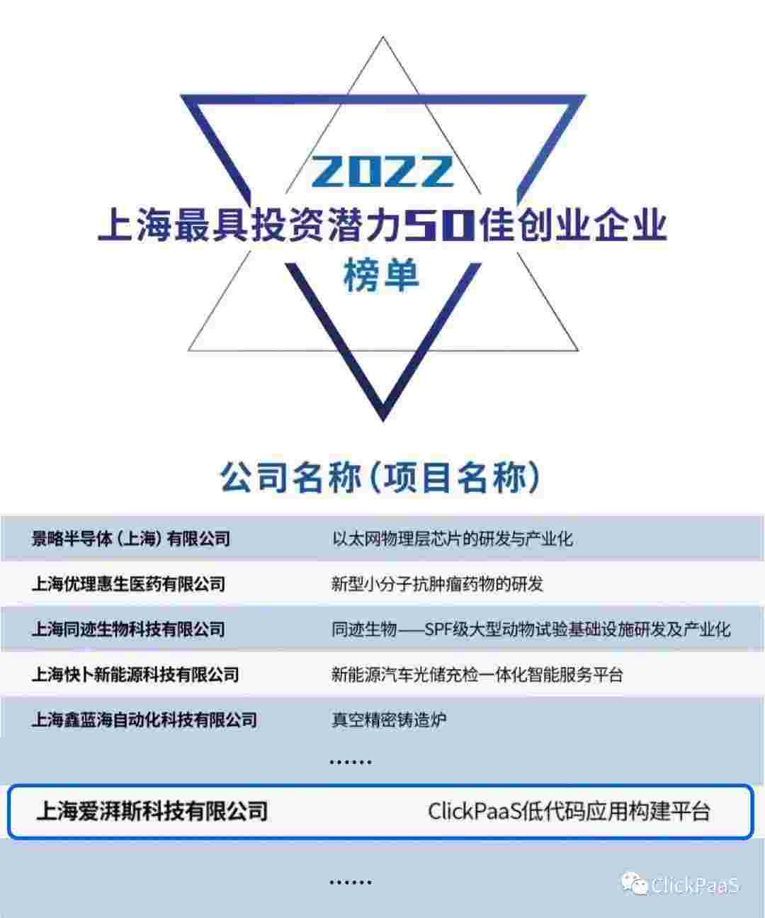 圆梦钱包 作为国内低代码PaaS平台的领军企业,,,,与120家创企入围角逐。。。。期间接受了来自德同资本、、、领中资本等知名投资机构的10位投资人组成专家评委团的背靠背盲选。。。并最终入围“2022上海最具投资潜力50佳创业企业”榜单,,被列入“上海市重点培育创业企业库”。。