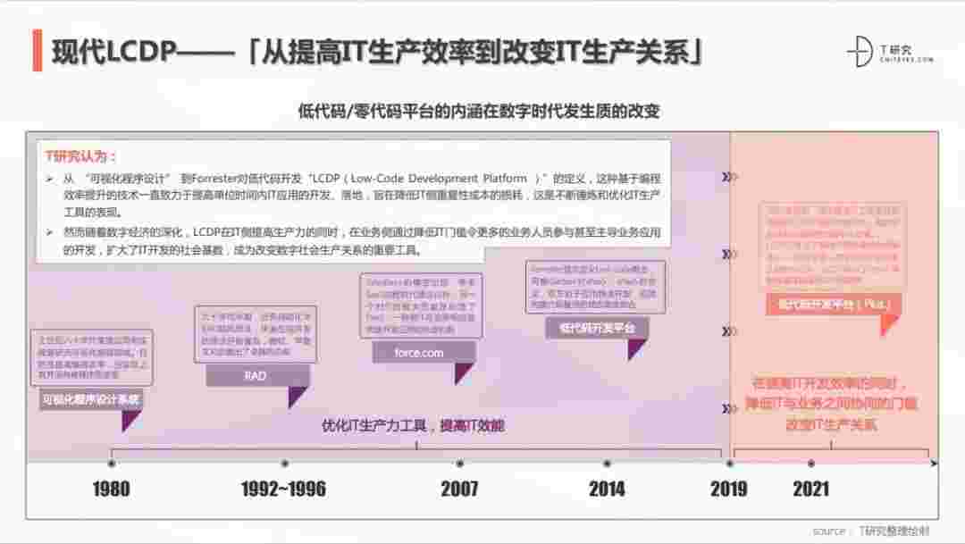 2020年前后,,源于提高IT工作者开发效能的LCDP不断进化和衍生,,面对业务导向日益明显的数字化变革。。。LCDP衍生出了面向不同对象的升级服务——面向专业人群的LCDP和业务人群的NCDP,,,,LCDP与NCDP的不同服务属性被逐渐认可和接受。。 LCDP在提高IT开发效率的同时,,降低IT与业务之间协同的门槛改变IT生产关系。。